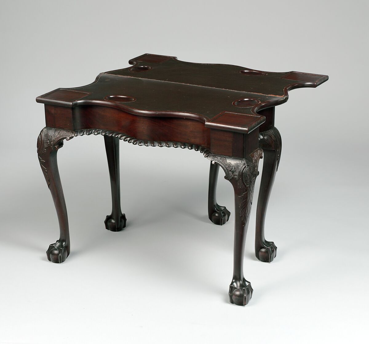 The most sophisticated New York Chippendale-style card tables have serpentine sides, shaped corners, gadrooned skirts, and five cabriole legs ending in claw-and-ball feet. The square corners supported candlesticks, and the four oval dishes held gaming counters.