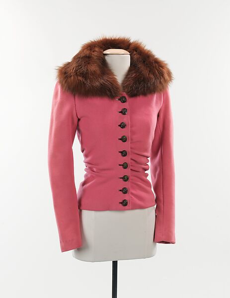 A classic example of Schiaparelli's fascination with unusual closures, this glamorous jacket was worn by style arbiter Millicent Rogers, one of Schiaparelli's most enthusiastic clients. From the winter 1938-39 zodiac collection, the buttons are an unexpected touch for such a chic jacket. Although it is not known what the imagery on the buttons was meant to be, the bearded face is reminiscent of Atlas, the Greek god who, as a punishment from Zeus, holds the heavens on his shoulders. The theme of that season's collection was zodiac, and included various references to the celestial realm, some more subtle than others, as these buttons illustrate. Schiaparelli often used closures as a way to express her creativity and used artists such as Jean Clement and Roger Jean-Pierre to execute her designs. This jacket is also exemplar of Schiaparelli's artistic design aesthetic, seen in particular by the asymmetric tucking and gathering and the oversized fur collar.