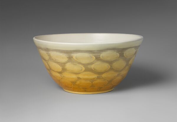 Arthur E. Baggs was hired to teach ceramics at Marblehead Pottery in 1905. When the pottery separated from the therapeutic workshops from which it was first associated, Baggs became the manager and designer. This bowl was thrown by hand on the wheel, decorated with oval circles, probably with a lathe, and covered in a mat glaze. Its geometric decoration is unusual for the pottery. More commonly objects were decorated with stylized floral or animal motifs. For other examples of Marblehead Pottery, see L.1982.137.1 and L.1982.137.4.