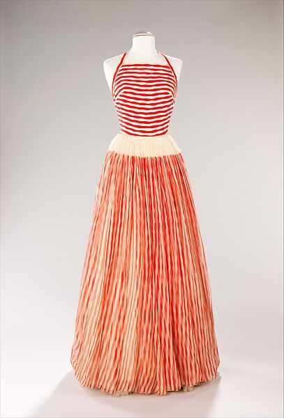 The choice of fabric is undoubtedly nautical inspired, the red and white undulating stripes representing rolling waves. Exquisitely pieced together, the stripes of the bodice are perfectly matched at the side seams. The flowing, layered skirt adds a sense of delicacy to the dress, with a jaunty sailor-like knot at back.