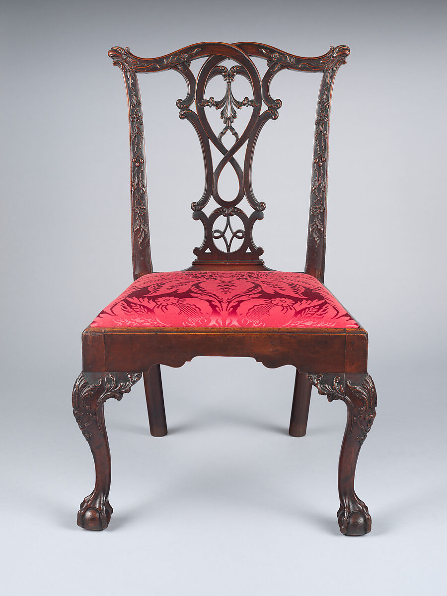 With its perfect proportions, elegantly integrated crest and splat design, and unsurpassed carving, this is perhaps the best of all Philadelphia Chippendale chairs. The splat pattern, its dominant figure-eight motif flowing from the crest rail, is a free adaptation from plate 16 of the third edition of Thomas Chippendale's Gentleman and Cabinet-Maker's Director (1762) (see 1982.1133).