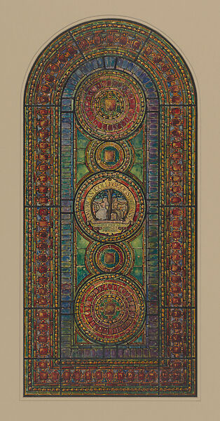This proposal for a medallion window for the John B. Murphy Memorial Auditorium of the American College of Surgeons in Chicago recalls similar compositions of interlocking circles in thirteenth-century Gothic windows. In the drawing's interpretation, the pictorial scenes that would have filled each of the medallions in an ecclesiastical setting are restricted to the central reserve, with the other medallions providing a show-case for Tiffany's jewel-like ornamental glass. Regrettably, Tiffany's design was not accepted, and the commission went to Willet Studio of Philadelphia, which adopted a more traditional Renaissance style.