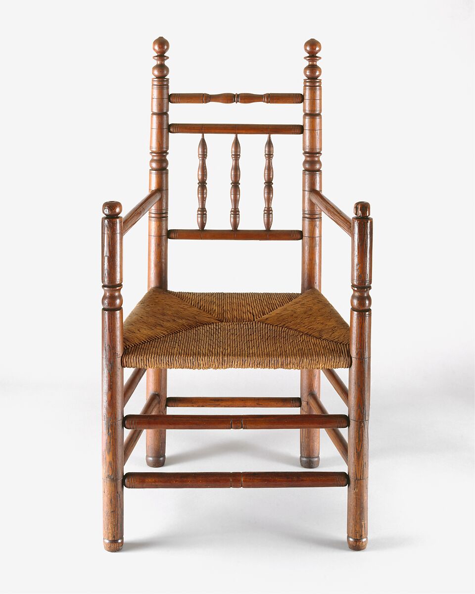 The finials on this chair fall within a broad category that features a prominent spherical form at the top above one or two reels, a ring, or ball in many configurations. Such finials are found on seventeenth-century turned chairs from southern New England, in southeastern Massachusetts (10.125.236) and the Connecticut shore (10.125.208) that appear to date toward the end of the 1600s, and in the eighteenth century they become ubiquitous.