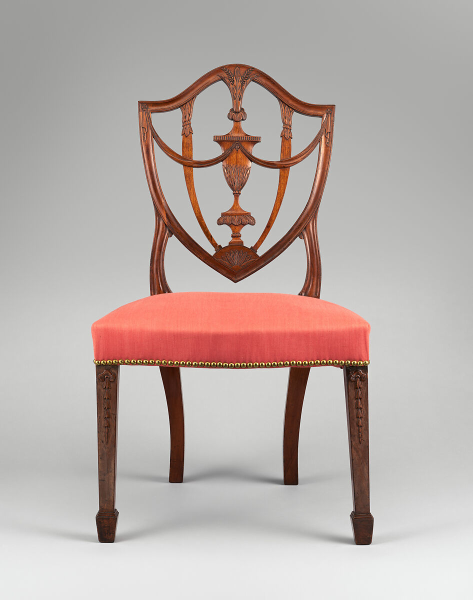 This chair and another in the collection (37.81.1) belong to a large group of seating furniture with carved ornament attributed to Samuel McIntire, a highly skilled architect and carver in Salem, Massachusetts. The bellflowers on the front legs and the urn with draped fabric on the back—standard motifs of the neoclassical style in the United State—were borrowed from decoration found on ancient Greek and Roman ceramics. The design for this vase-back chair was based on plate IId in Hepplewhite and Company's "The Cabinet-Maker and Upholsterer's Guide" (London, 1788).