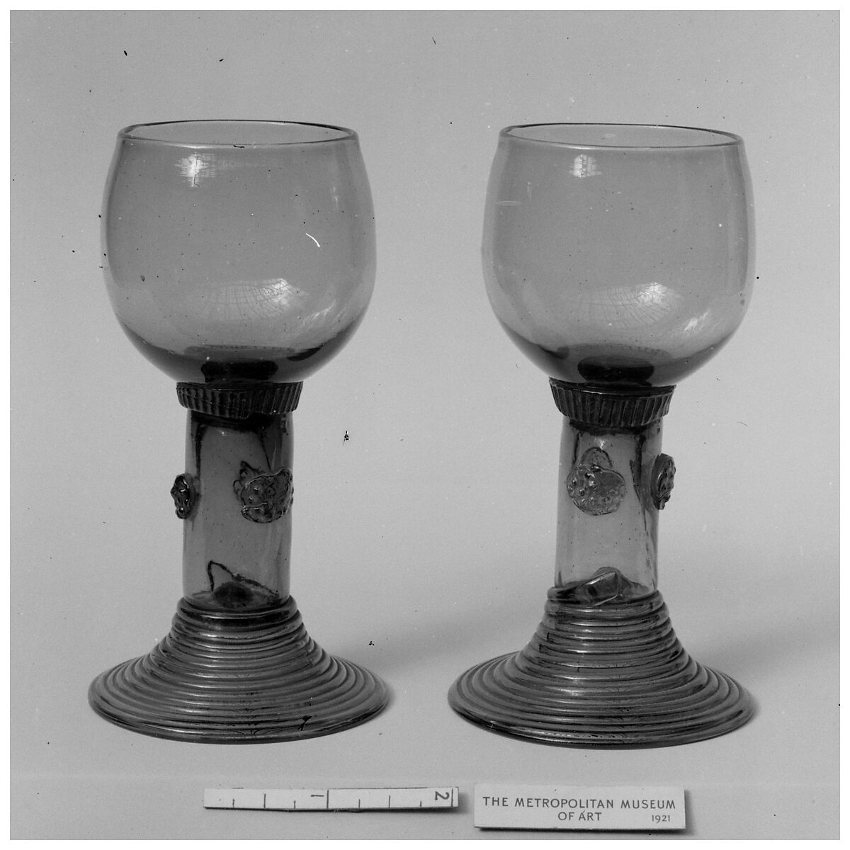 This shape of drinking vessel, with a foot made of a continuous spiral thread coiled and fused, originated in medieval times and was long popular in Germany.