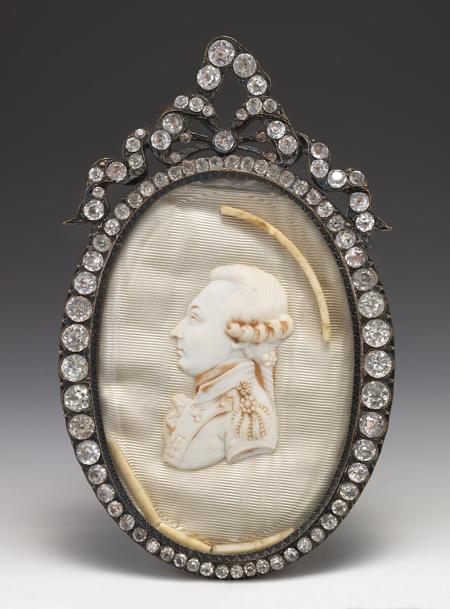 - Medium: Bust: ivory; background: white moiré silk; frame: silver with 90 brilliants