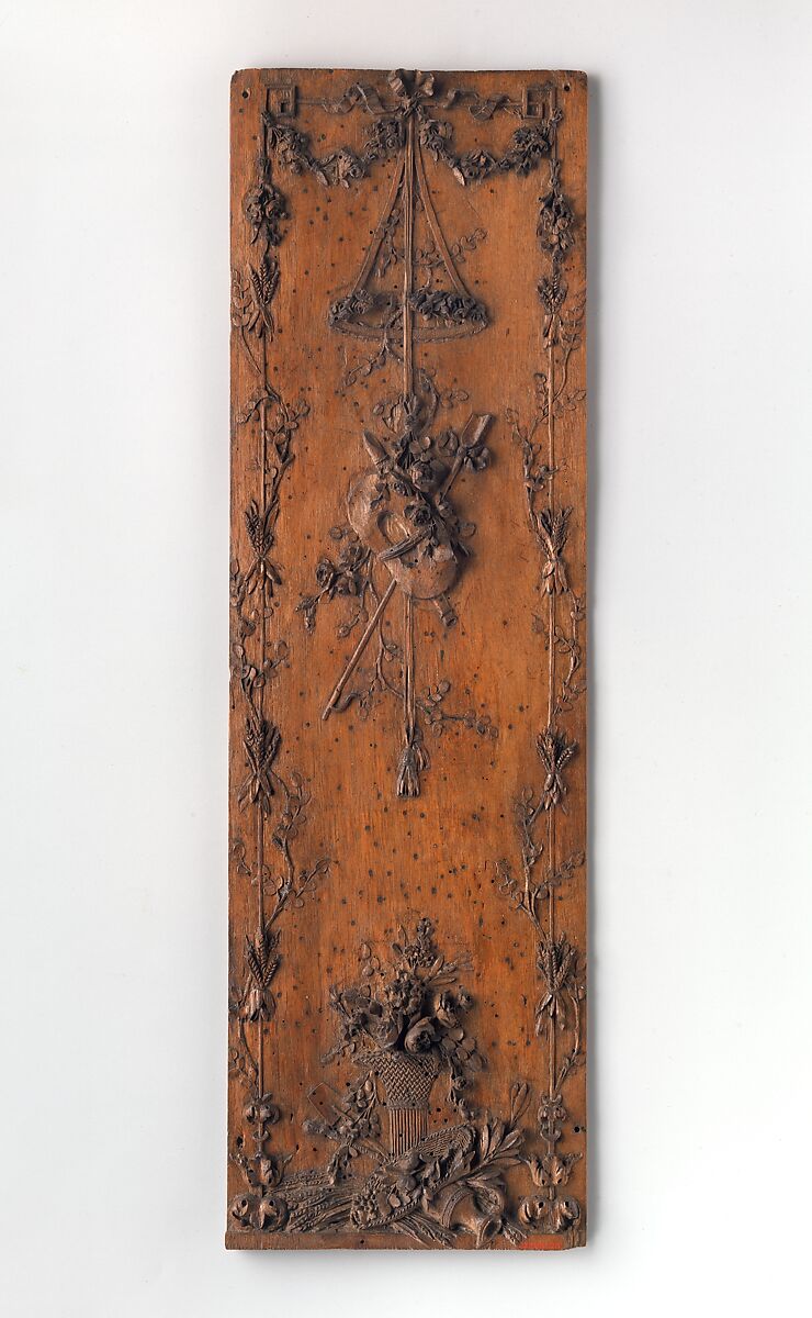 This panel displays delicate low relief carving of floral garlands, a floral wreath, a trophy of gardening tools and sunhat as well as a small still life below consisting of an overturned ewer, a sun hat, wheat ears, laurel branches and gardening tools. The small scale of this neoclassical panel and the high quality carving suggest it may have been made by a decorative sculptor as a masterpiece for presentation at the Académie royale d’architecture (Royal Academy of Architecture) in order to show his talent and secure future commissions.