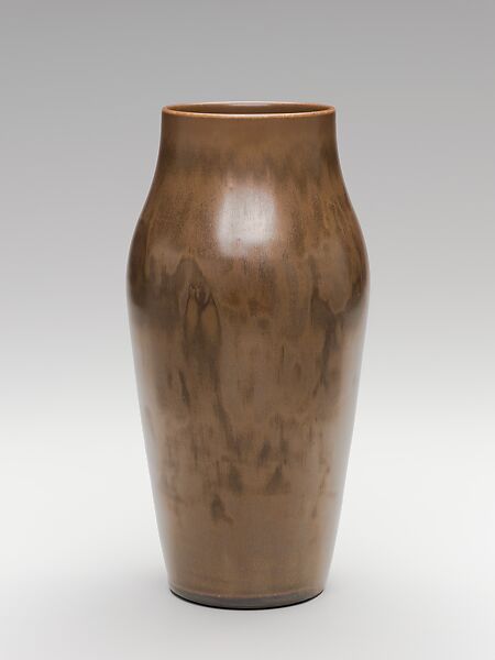 The Grand Feu Pottery in Redlands, California, due east of Los Angeles, was founded by Cornelius Walter Brauckman in late 1912 or early 1913. For the first five or so years that it was in operation the firm produced elegantly shaped vases with a variety of sophisticated glazes, like this example. Regrettably, little is known of Brauckman and his art pottery. Born of Prussian émigré parents, he grew up in St. Louis, and in 1880 studied briefly at the School of Fine Arts at Washington University. By 1894, however, he was in California, and was described variously as a farmer, rancher, and prospector. It was his discovery of clay beds on his land in Redlands that prompted him to develop a pottery. It is likely that Brauckman may have sought help from Fred Robertson in nearby Los Angeles. In fact, the works of both potters show an affinity for micro-crystalline glazes. Sometimes called the Brauckman Art Pottery, Brauckman gave his enterprise the name Grand Feu Art Pottery, an appellation that signified a high-fired ware. The French term means "high fired," referring to ware fired at 2,600 degrees Fahrenheit. A grand feu body is a highly refined stoneware, almost like porcelain but without kaolin and the resulting translucency. This modified baluster-form vase is sheathed in a lustrous matte glaze with nuanced tones of soft brown. The gentle irregularities of the earth tones are subtle and invite close observation. A similar glaze is on a vase that was part of a gift of four that Brauckman in 1913 to the Smithsonian Institution. At the time of the presentation, Brauckman referred to the glaze as "Mission."