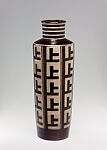 Grotell’s move to the Cranbrook Academy of Art, outside of Detroit, Michigan, marked the turning point in her career. Although she was initially turned down for a position because of her gender, Grotell was hired in 1938 as a pottery instructor (the post held previously, if only briefly, by Waylande Gregory). A consummate craftsman, Grotell evolved a sophisticated, geometric style at Cranbrook. At the same time, with access to a large kiln, she could throw pots on a scale far grander than previously. As seen in this tall cylindrical vase, Grotell’s decoration evolved into a strong, graphic idiom. The design was likely inspired directly by the architect Eliel Saarinen, Cranbrook’s director, and his particular brand of modernism. Grotell’s bold, stepped design recalls the doors and ceilings that her compatriot created for Cranbrook, and which she would have experienced on a daily basis. Likewise, the vase’s concentric accentuated throwing rings echo Saarinen’s emphasis on craftsmanship. The integrity of her approach to ceramics inspired many American potters of the next generation.