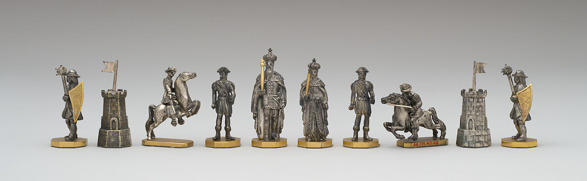 Height (silver knight, confirmed): 2 1/8 in. (5.3 cm); Overall (board, confirmed): 1 7/8 × 14 × 14 in. (4.8 × 35.6 × 35.6 cm). - Classification: Chess Sets
