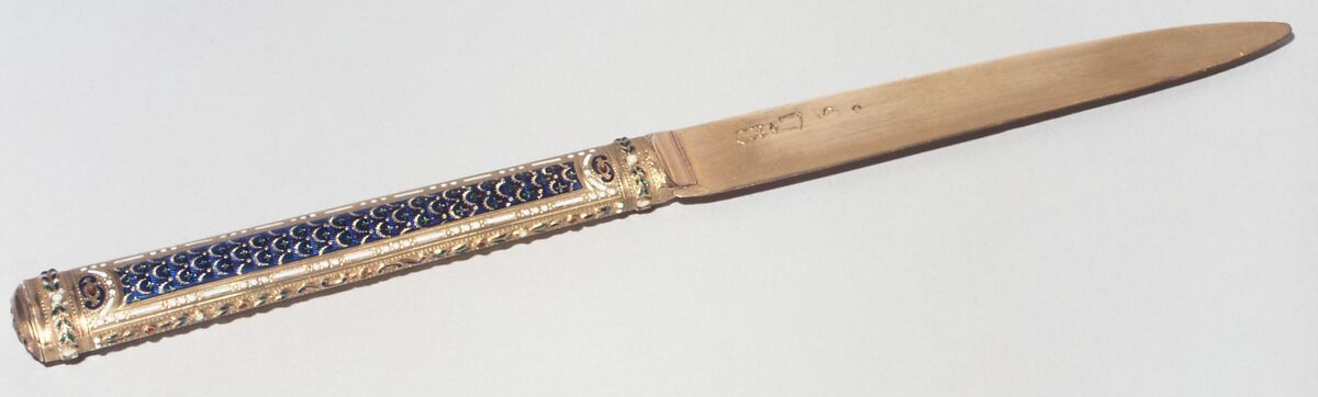 Knives of this delicacy were probably not used on the dining table although it is possible this example might have been a fruit knife. Enameled gold knives are mentioned occasionally in eighteenth-century documents but without any indication as to their use.