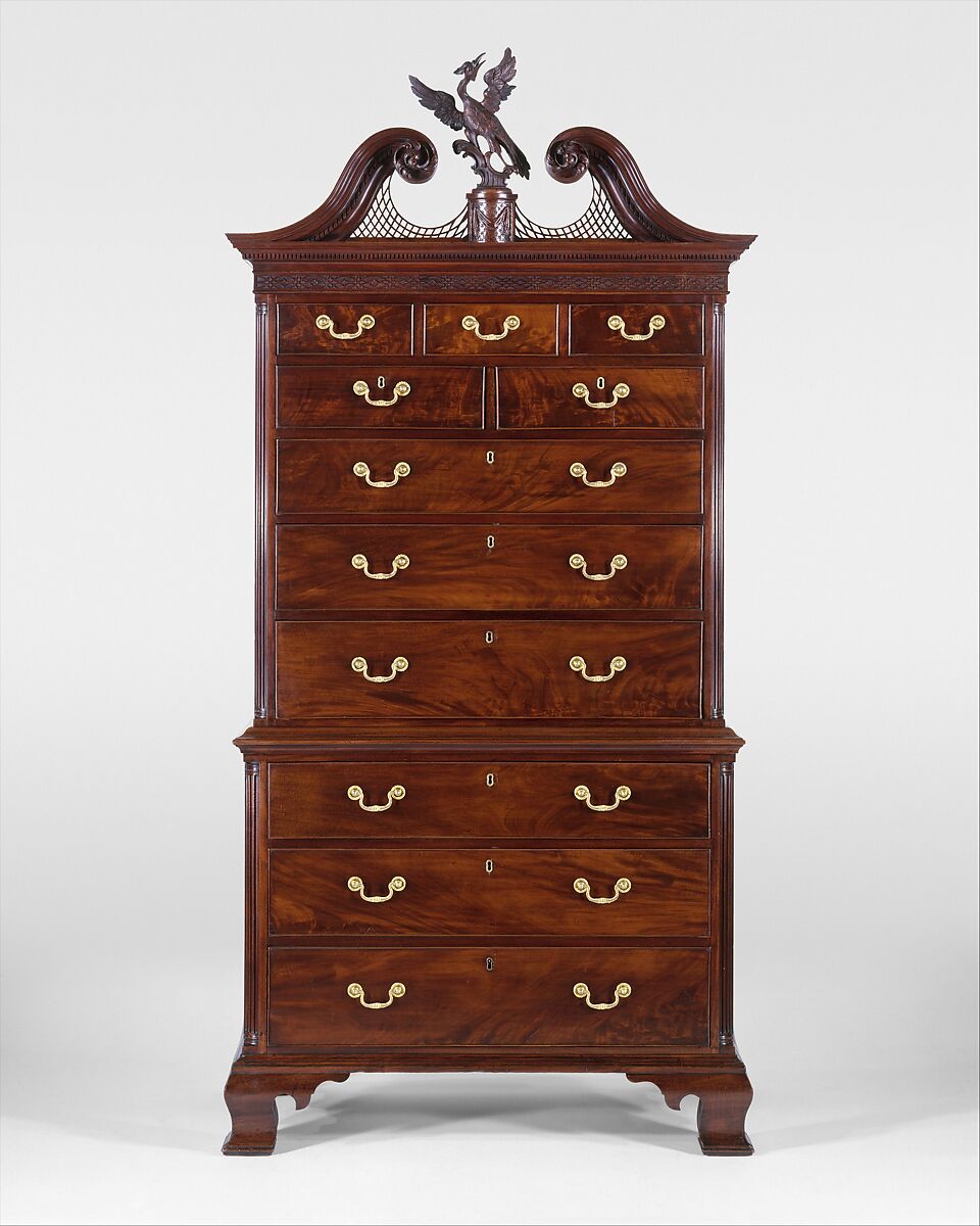 This chest epitomizes the Chippendale style: classical architectural forms are dynamically juxtaposed with romantic, naturalistic ornament. On the basis of a 1772 entry in the ledger of William Logan, in whose family the chest descended, it has been attributed to the Scottish immigrant cabinetmaker Thomas Affleck and the carver James Reynolds.