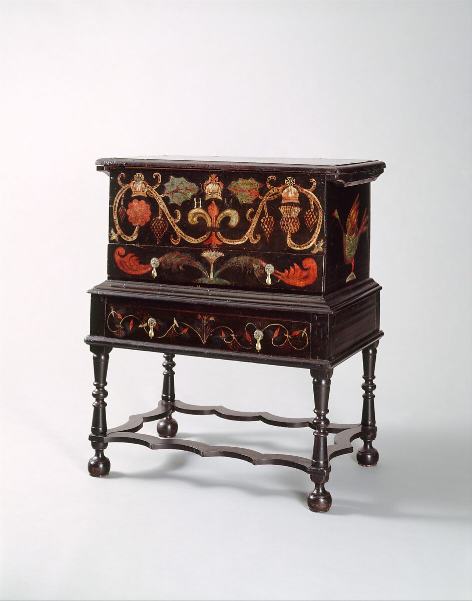 The painted ornament on the upper front of this chest, with its crowned Tudor rose, Scottish thistle, and French fleur-de-lis, is typical of designs on furniture produced in the Guilford-Saybrook area of coastal Connecticut. The painted borders on the top recall the inlaid-veneer crossbanding found on high-style English furniture of the seventeenth century.