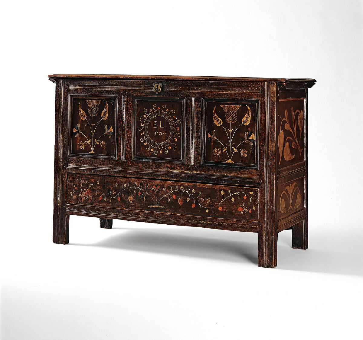 Inscribed “EL 1705,” this is one of six similar joined chests from Connecticut bearing dates between 1704 and 1706. The painted decoration on its three front panels echoes the carving of the “sunflower” chests of Hartford County, which it also resembles in its form and construction.