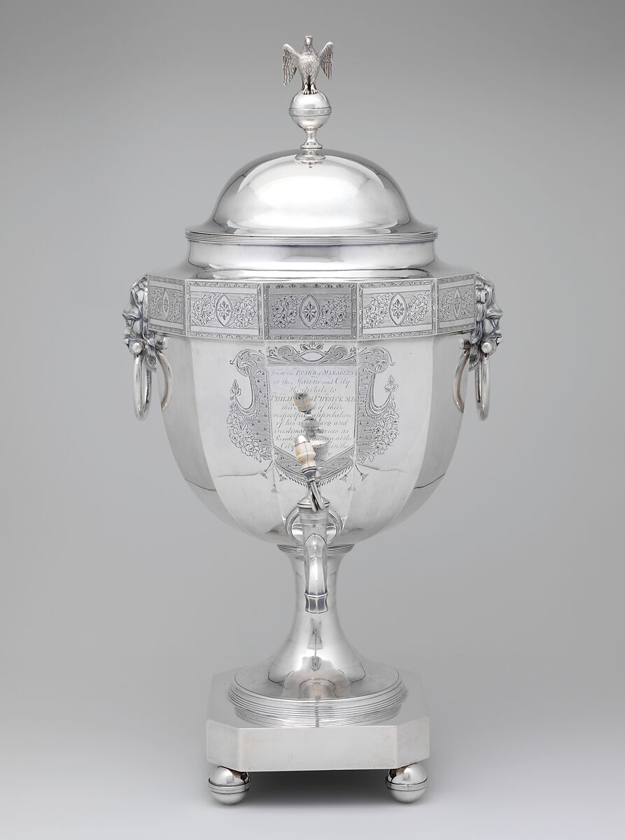 The yellow fever epidemics of 1793 and 1798 devastated the city of Philadelphia, killing thousands and forcing many to flee what was then the nation’s capital and largest city. Among those who remained behind to tend the stricken was Dr. Philip Syng Physick, “the father of American surgery.” For his exceptional dedication and self-sacrifice, the board of managers of the City Hospital presented him with these two magnificent pieces of silver—a tea tray and a hot-water urn—fashioned in the Neoclassical style, with bright-cut paterae and floral festoons. Each piece is engraved with the dedicatory inscription “From the Board of Managers of the Marine & City Hospitals to Philip Syng Physick, M.D., this Mark of their respectful approbation of his voluntary and inestimable services as Resident Physician at the City Hospital in the Calamity of 1798.”