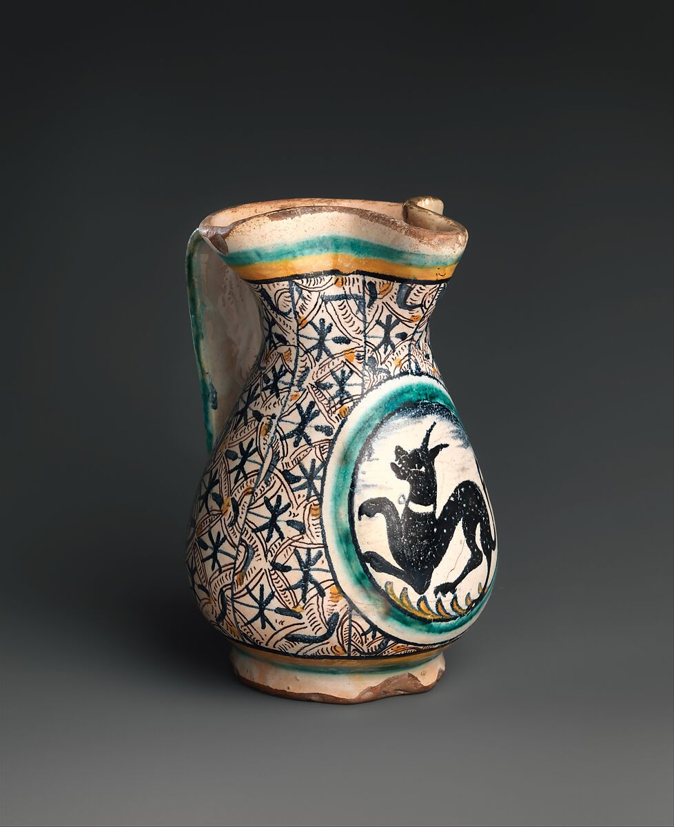 Jugs ornamented with heraldic animals were very popular and were widespread; the shape of this one is typically Tuscan. Examples like this were traded extensively and one is represented in the famous Merode Triptych, painted in the Netherlands around 1430 and currently on view at the Cloisters (see metmuseum.org/collections).