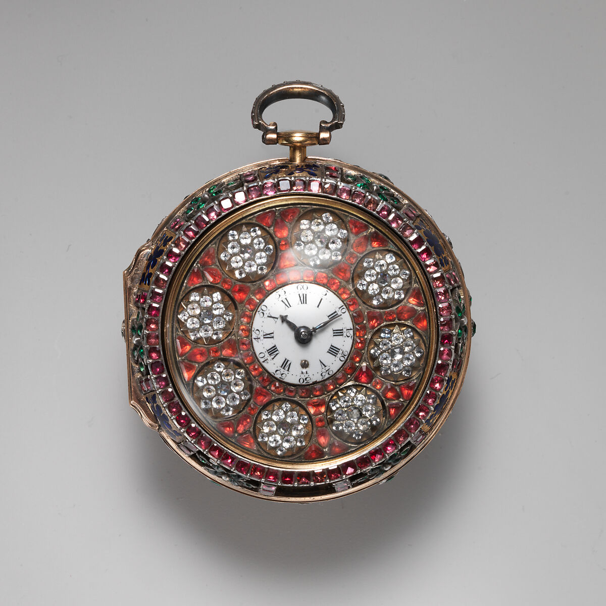 - Medium: Outer case: gold, partly enameled and set with gemstones and paste jewels; Inner case: gold; Dial: white enamel, with frame set with paste jewels; Movement: with diamond endstone