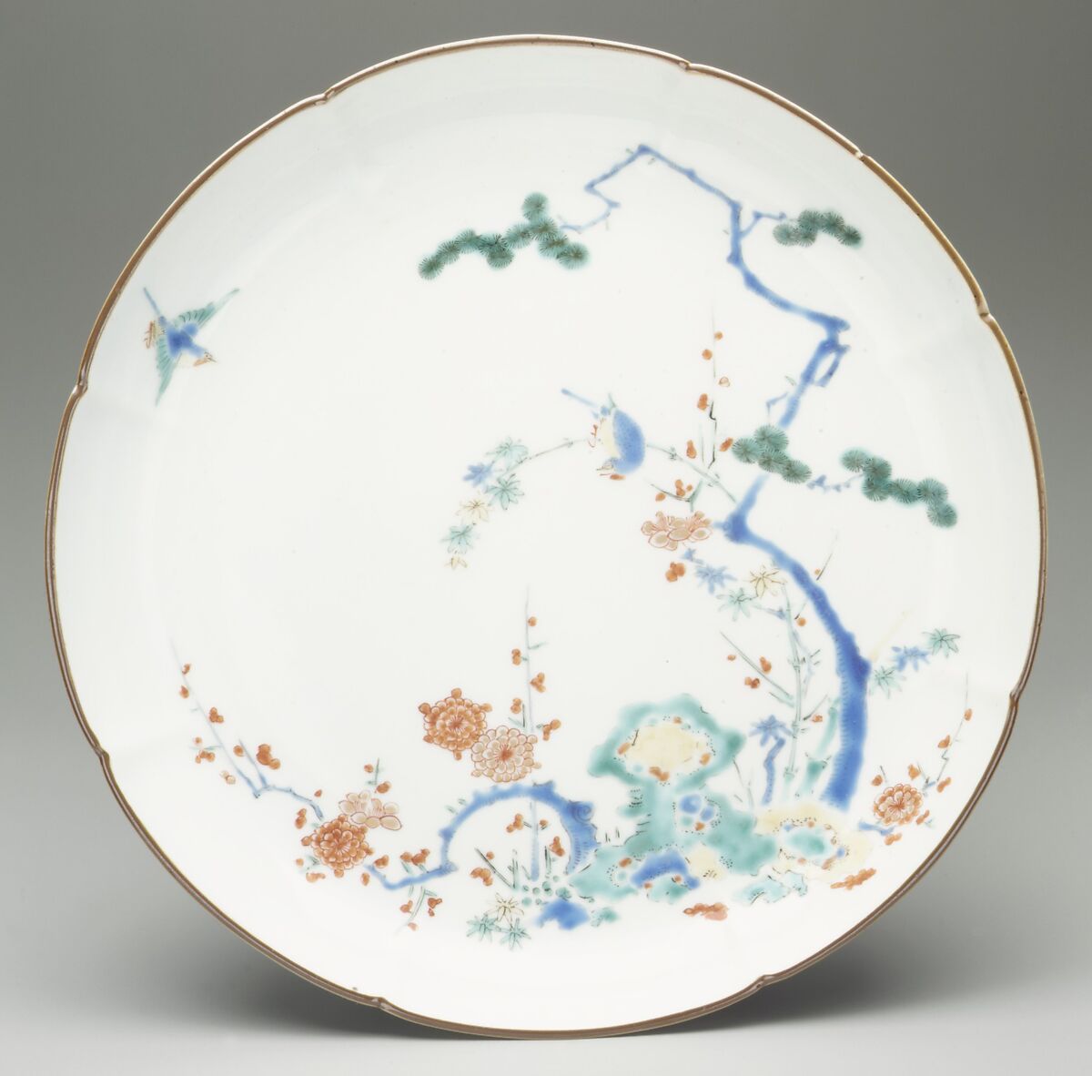 Small compositions of birds and trees or flowers are a mainstay of Japanese painting. They often carry seasonal or literary associations. This grouping of birds, a rock, and the Three Friends (a Chinese literati theme) relates to Chinese traditions and symbolism of the plum for forbearance (as it blossoms in early spring), the bamboo for flexible strength, and the pine for venerability but still retains the Japanese lyrical approach to the natural world.