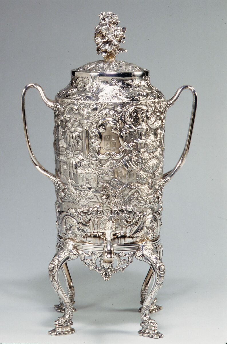 This coffee urn belongs to a tea and coffee service containing nine pieces. Decoration in relief covering the whole surface of the object was popular in Baltimore from the 1830s to the end of the century. Here, the rich repoussé ornament features chinoiserie scenes. The shapes of the teapots and the sugar bowl, unusual in silver, were copied from Chinese export porcelain forms of the early 1800s. The service was made for James Hamilton Wilson of Baltimore in 1845, the year he married.