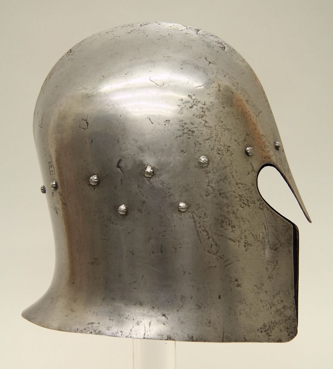 Most Italian barbutes have a T-shaped face opening. The rounded eye openings and pointed nasal of this helmet are very unusual. It is stamped with two marks, a castle and the letter P beneath a split cross, identified as the armorer Pietro da Castello (documented in Brescia from 1469 to 1486, died before 1498).