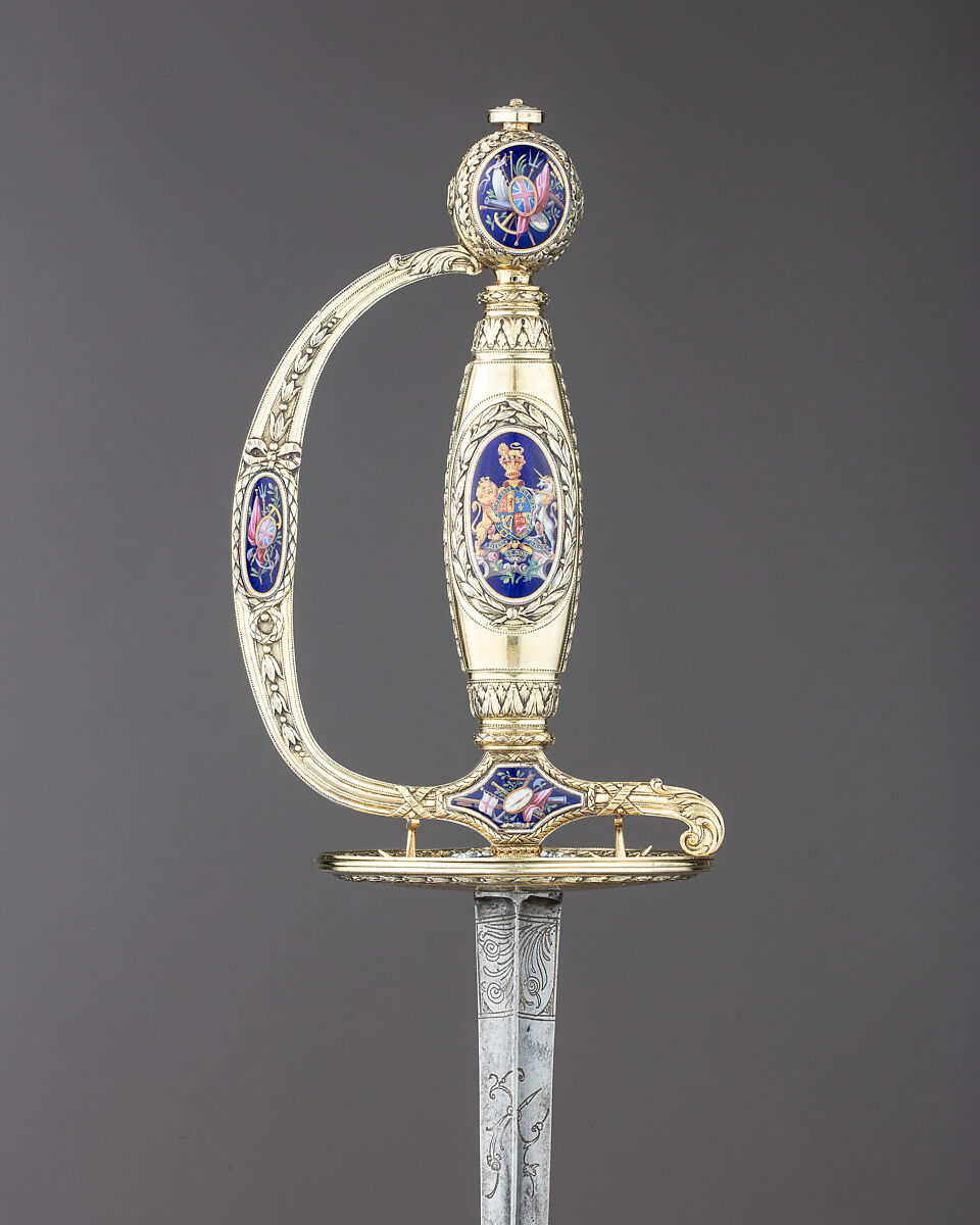 English smallsword hilts in gold or silver-gilt, set with colored enamels, were the specialty of the London goldsmith James Morisset. The majority were created for presentation to British naval officers during the Napoleonic wars. This example is inscribed on the underside of the shell: "The Committee of Merchants of London presented this sword to Lieutenᵗ John Burn for his active and spirited conduct on board His M.S. the Beaulieu during the late mutiny at the Nore in 1797. Hugh Inglish Esq., Chairman."