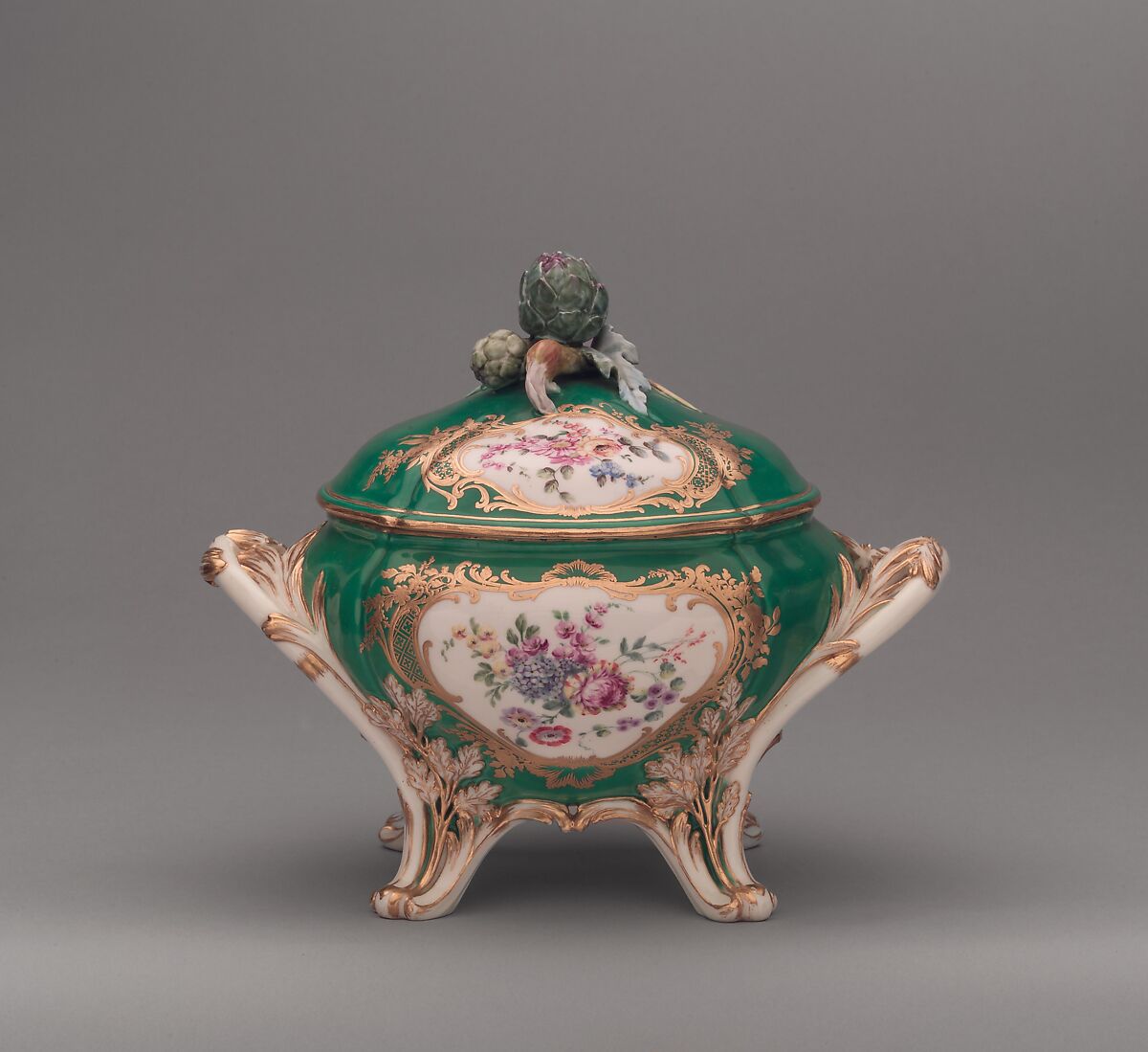 The curvilinear forms of this tureen and the asymmetry of the gilding reflect the characteristic features of the French rococo style. This is the smallest of the tureens produced by the Sèvres factory; records indicate that Louis XV purchased a green-ground tureen of this uncommon size in 1758.