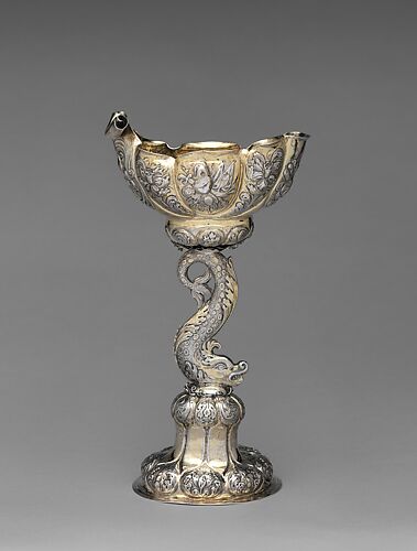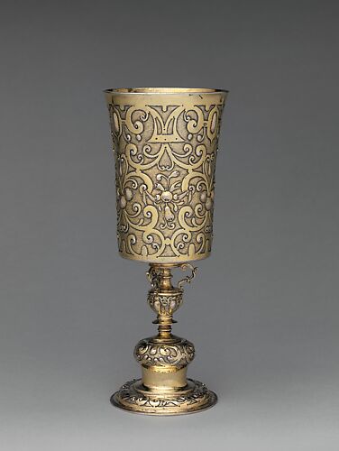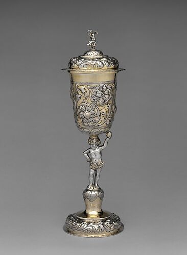 Both parts of this double cup have tall lips that fit into one another. The cups can be stacked and displayed as a decorative object when not in use. The double-cup was a form produced only north of the Alps, and these ceremonial items served frequently as wedding gifts. The scrollwork and cherub ornament can be directly related to prints by Paulus Flindt (German, 1567–1611) His designs, published in Nuremberg and Vienna in various editions, were among the most influential decorative sources for European goldsmithing around 1600.