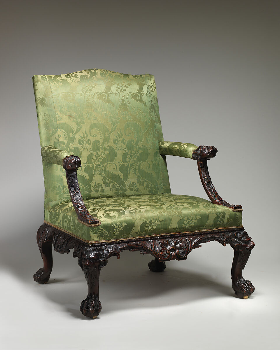 - Medium: Mahogany; upholstered with modern damask