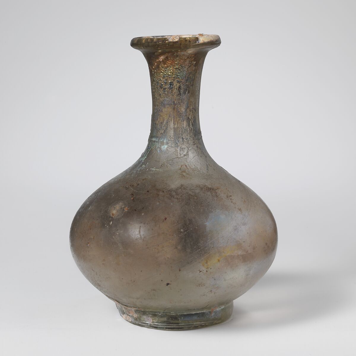 Rim folded over and in, with beveled outer lip; flaring mouth; concave neck; bulbous body; integral, solid base ring; pushed-in bottom, with trace of large pontil scar.