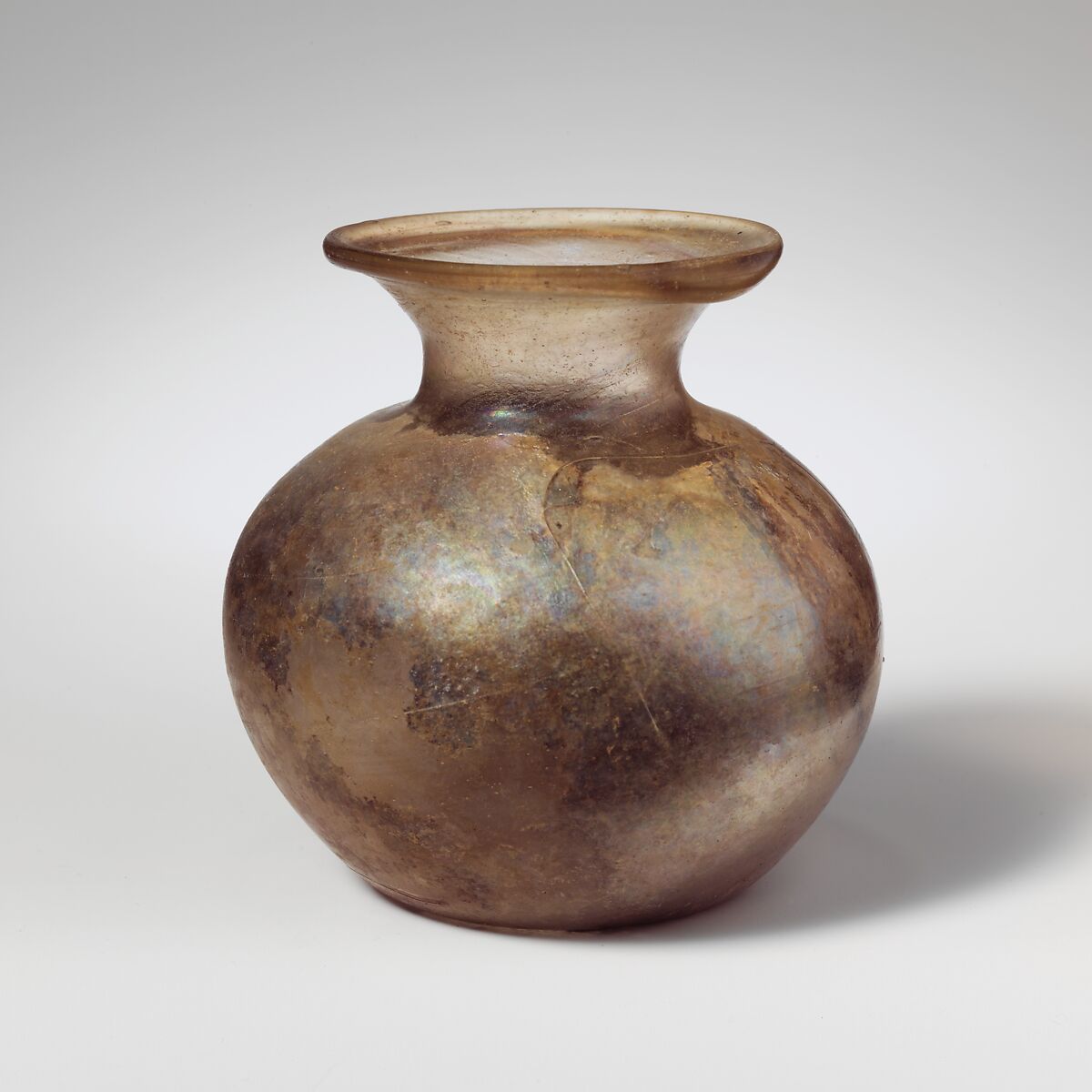 Rounded, thickened rim with bulge in one side; broad, flaring mouth; short, concave neck; sloping shoulder; bulbous body; pushed-in bottom with kick and pontil scar.