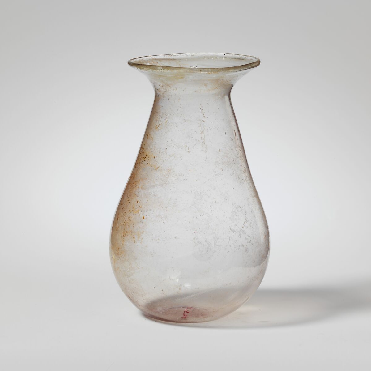 Plain, rounded rim; flaring neck; elongated piriform body; small, concave bottom.