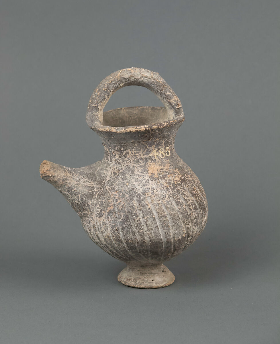 Grooved body, handle and tubular spout, light clay under dark slip.