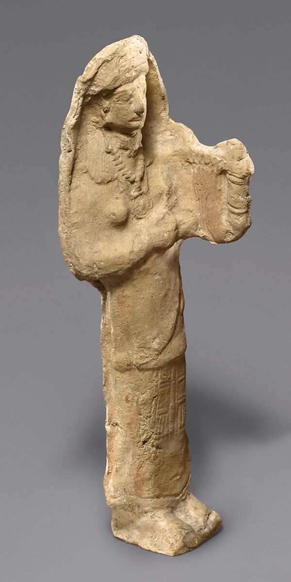 The complex dress and amount of jewelry suggest that this figure may be a priestess of the Great Goddess of Cyprus. She holds a lyre in her left hand.