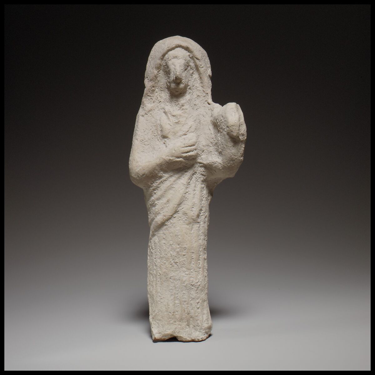 The solid figurine was made from a worn mold and crudely smoothed. Her feet are missing. She holds a lyre in her left hand and gives the semblance of playing it with her right.