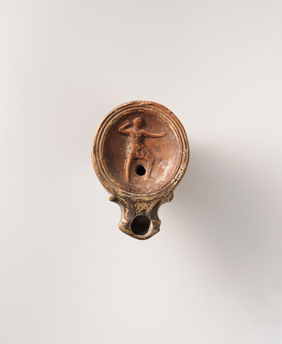 Loeschcke Type 1A. Mold-made. Deep, small body. Discus: man (athlete or boxer?) standing and facing right, wearing short tunic (?), with his right arm raised behind his head and his left arm outstretched in front of him a single filling hole at bottom center between his legs; band of fine lines and grooves at edge. Volutes flanking angular nozzle, with large wick hole. Undefined, flat base.