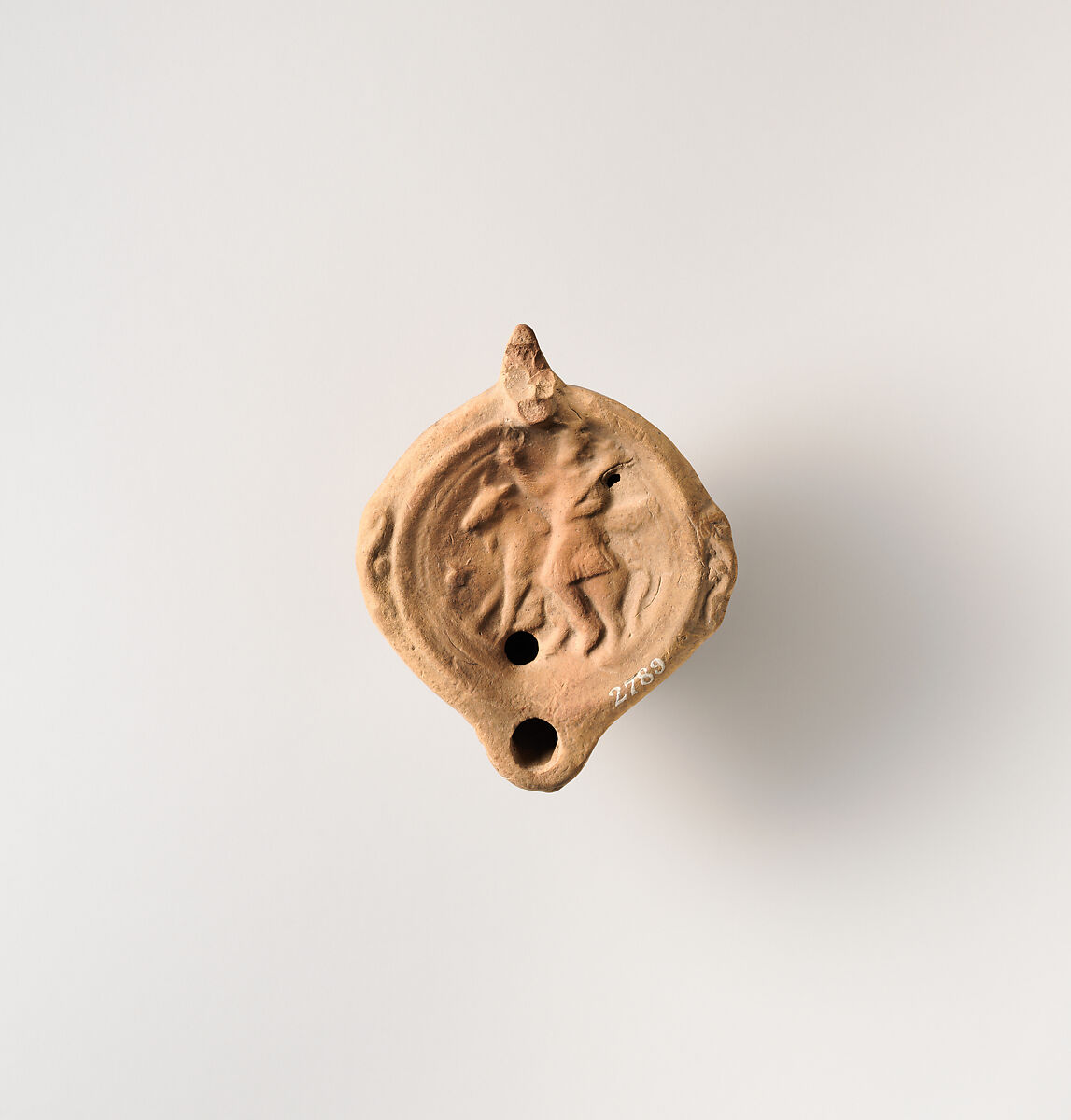 Broneer Type 27. Mold-made, with ring handle. Discus: in high relief, bull moving left and carrying on his back a figure wearing a knee-length tunic and a headdress, holding a stick-like object in left arm across shoulder and another indistinct object in raised right hand; a small, footed krater in field at left; a single filling hole at bottom; raised band around discus and two scrolled projections at sides. Undefined, slightly uneven base.