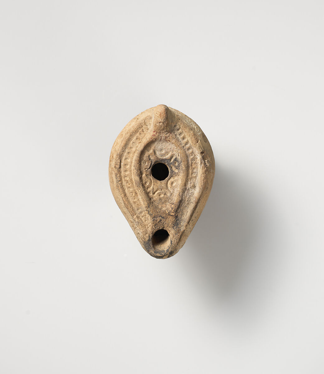 Mold-made, with unpierced handle. Discus surrounded by a raised oval line that runs towards the wick hole; within, a crescent star pattern, with circles or squares interspersed. On shoulder, a narrow nband of lines, with another raised line running around the edge. Undefined base.
