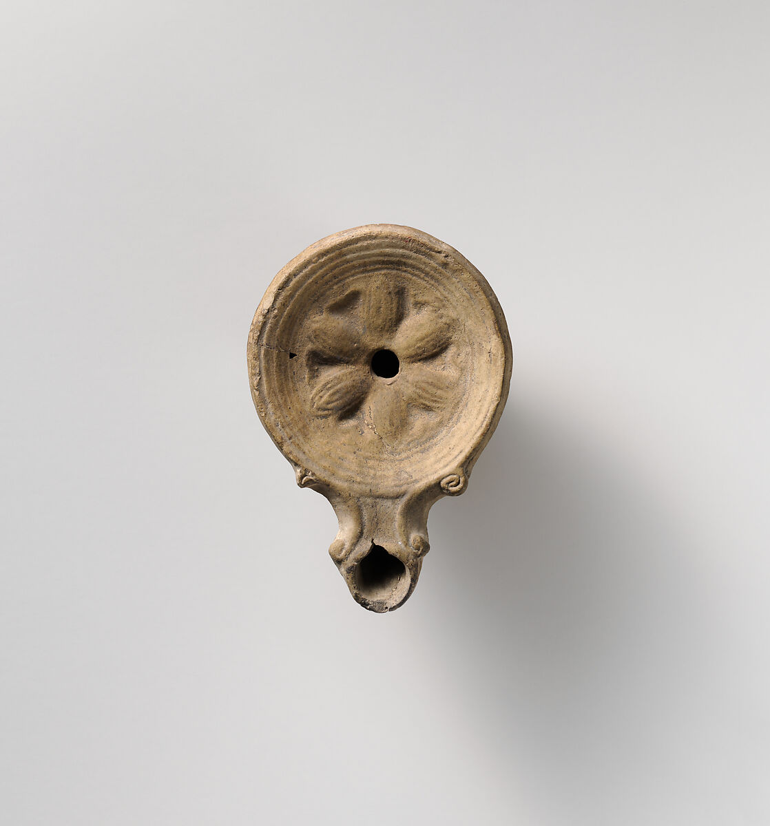 Loeschcke Type 1A. Mold-made. Discus: six large flower buds (or petals) in relief, radiating from a central filling hole, with a broad band of lines and grooves at edge. Volutes flanking nozzle. Within narrow, incised base ring, flat base, with impressed letters across center: FAVSTI, and below: Y.