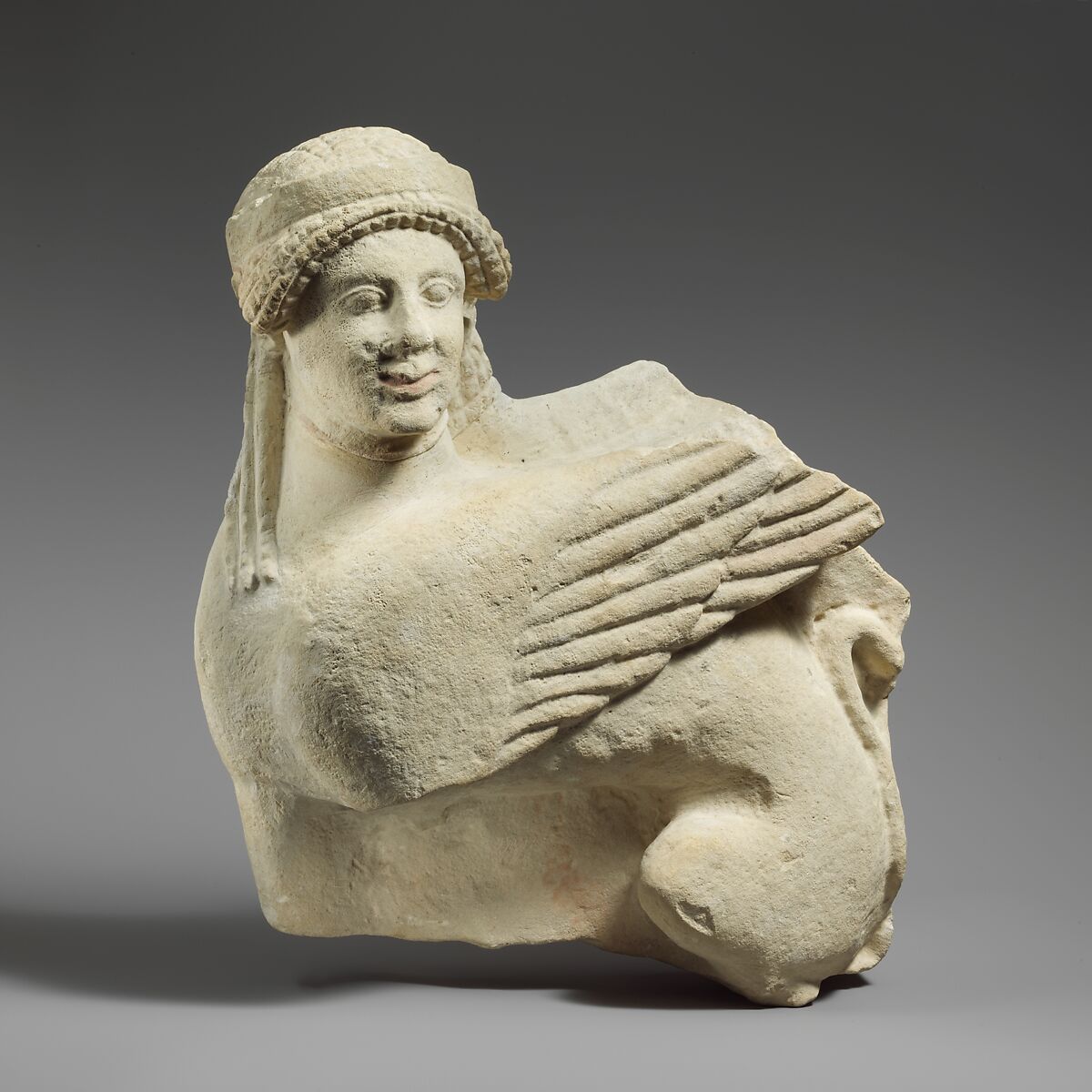 - Title: Fragment of a limestone funerary stele with a seated sphinx