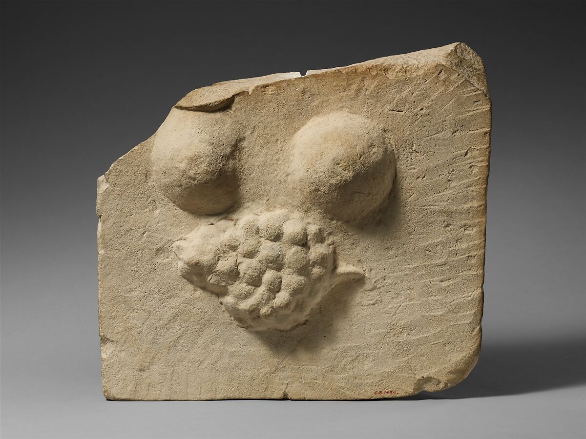 - Title: Limestone plaque with breasts and a bunch of grapes in relief