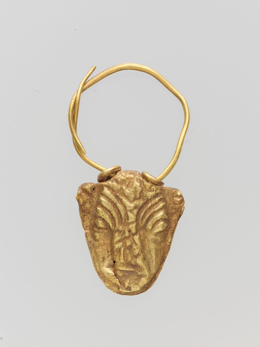 Most of the raw materials for Cypriot jewelry came from the East. Gold became plentiful in the Late Bronze Age, when Syria and Egypt were the primary sources. These earrings are a Cypriot creation, an ornament in the form of a bull's head.