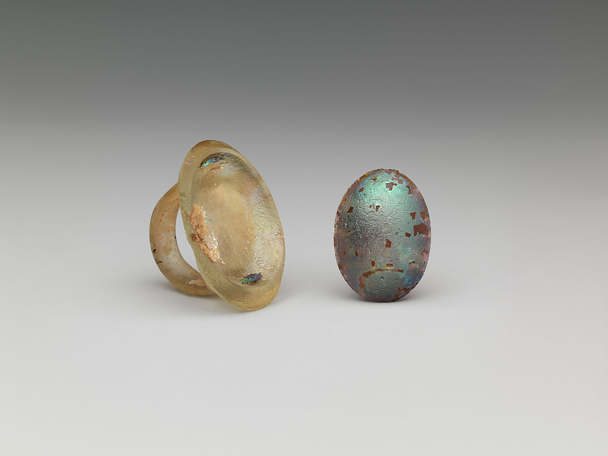 Associated witht the ring is a separate lens-shaped oval gem made out of translucent pale purple blown glass that fits approximately into the concave face of the ring with the convex side facing outward. The gem is intact, has many bubbles, and is covered with pitting and brilliant iridescence.