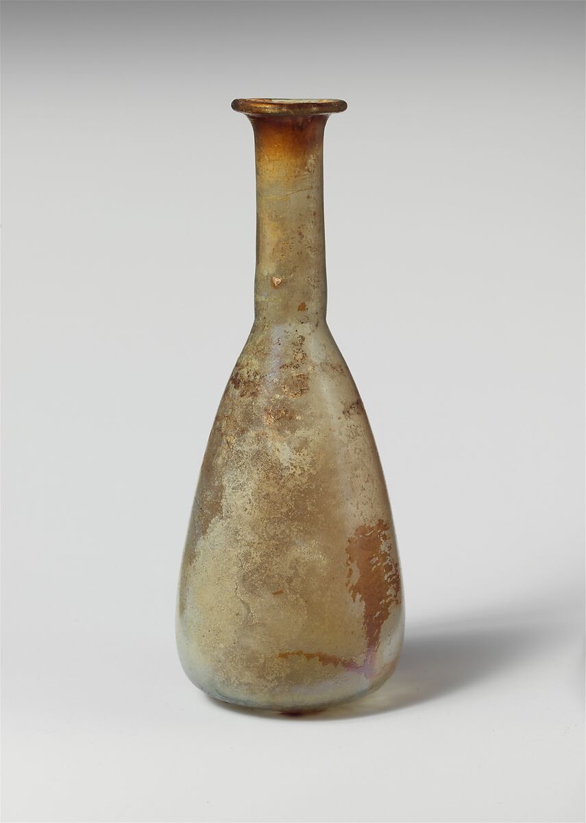 Rim folded out, over, and in; flaring mouth; tall cylindrical neck with slight indent around base; elongated piriform body; bottom concave at center.