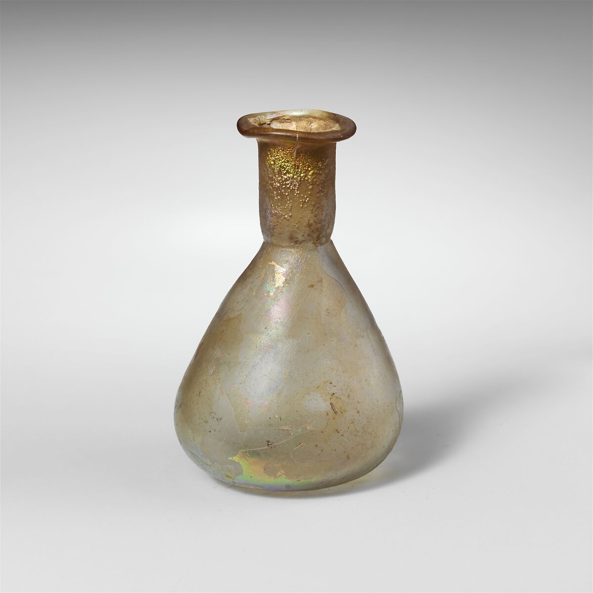 Intact; pinprick bubbles; pitting, dulling, and faint iridescence on exterior, and creamy weathering with iridescence on interior of neck.