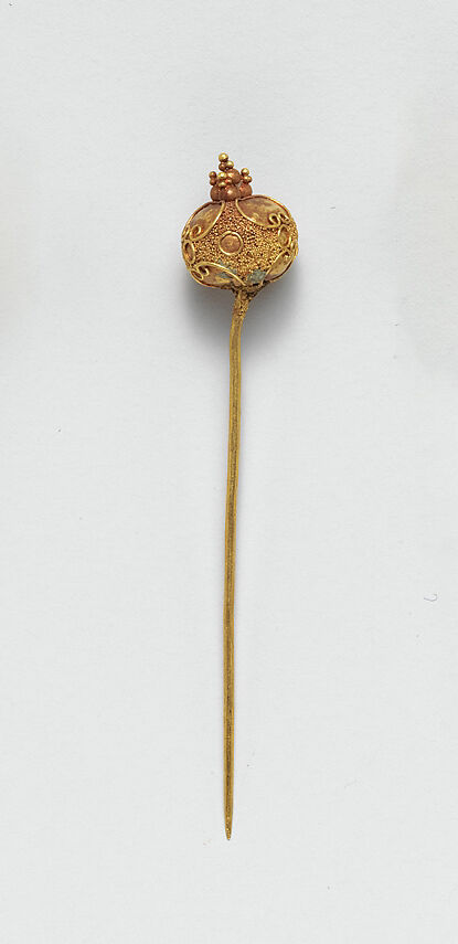 Globular head ornamented with granules and filigree, surmounted by pyramid of granules.