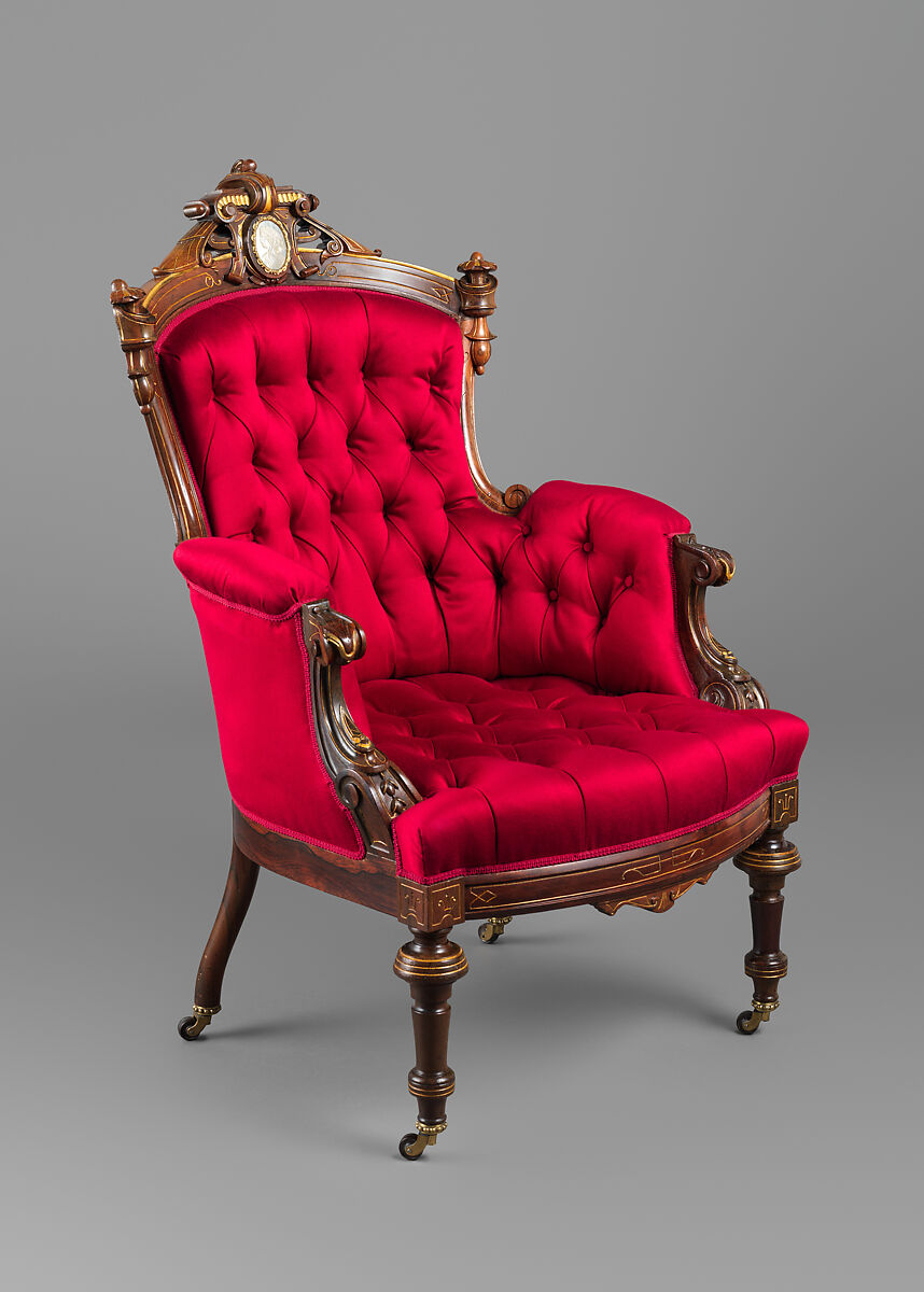 This armchair, one of a pair (see 68.133.2), originally furnished the sitting room, or rear parlor, of the mansion built for Jedediah Wilcox at 816 Broad Street in Meriden, Connecticut. Completed in 1870, the house was heralded as one of the state’s grandest residences. The room’s en suite rosewood furnishings, which included a sofa (68.133.1), side chairs (68.133.4-.5), an overmantel mirror (68.134.11), and window cornices (68.134.8-.10), are embellished with mother-of-pearl medallions featuring a lady’s head in profile and incised and gilded decoration. The suite is attributed to John Jelliff and Co. of Newark, New Jersey, based on a nearly identical armchair in the collection of the Newark Museum of Art and its accompanying bill of sale from the Jelliff firm. Although Jelliff and Co. operated a showroom in Newark, they also retailed their furniture across the country through a variety of regional wholesalers. Wilcox, or perhaps the building’s architect and superintendent Augustus Truesdell, likely purchased the furniture through a Connecticut- or New York-based retailer who sourced their inventory from various cabinetmakers.