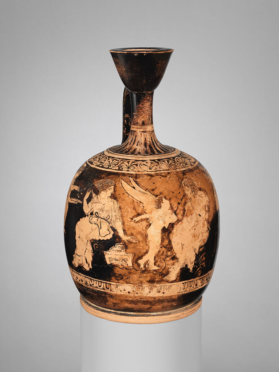 Chrysippos, wearing the boots, mantle, and broad-brimmed hat of a traveler, talks with Eros who points toward Aphrodite. Next to the goddess stands a casket, on it a pair of shoes. The woman to the left is unidentified, the other one is Pompe (the personification of procession). Beside her are traces of a ritual basket that would have been depicted in applied clay with gilding. The details of the scene point to a marriage procession.