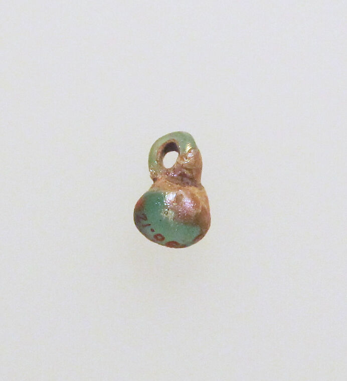 Pear-shaped glass pendant, translucent blue green in color. Probably used as an earring.