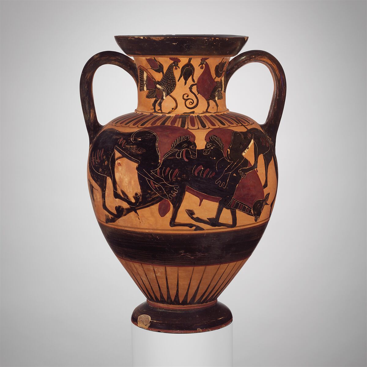 Obverse, on the body, lions attacking a bull; on the neck, two roosters