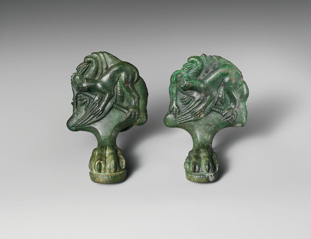 - Title: Pair of bronze cista (toiletries box) feet with panthers attacking cranes